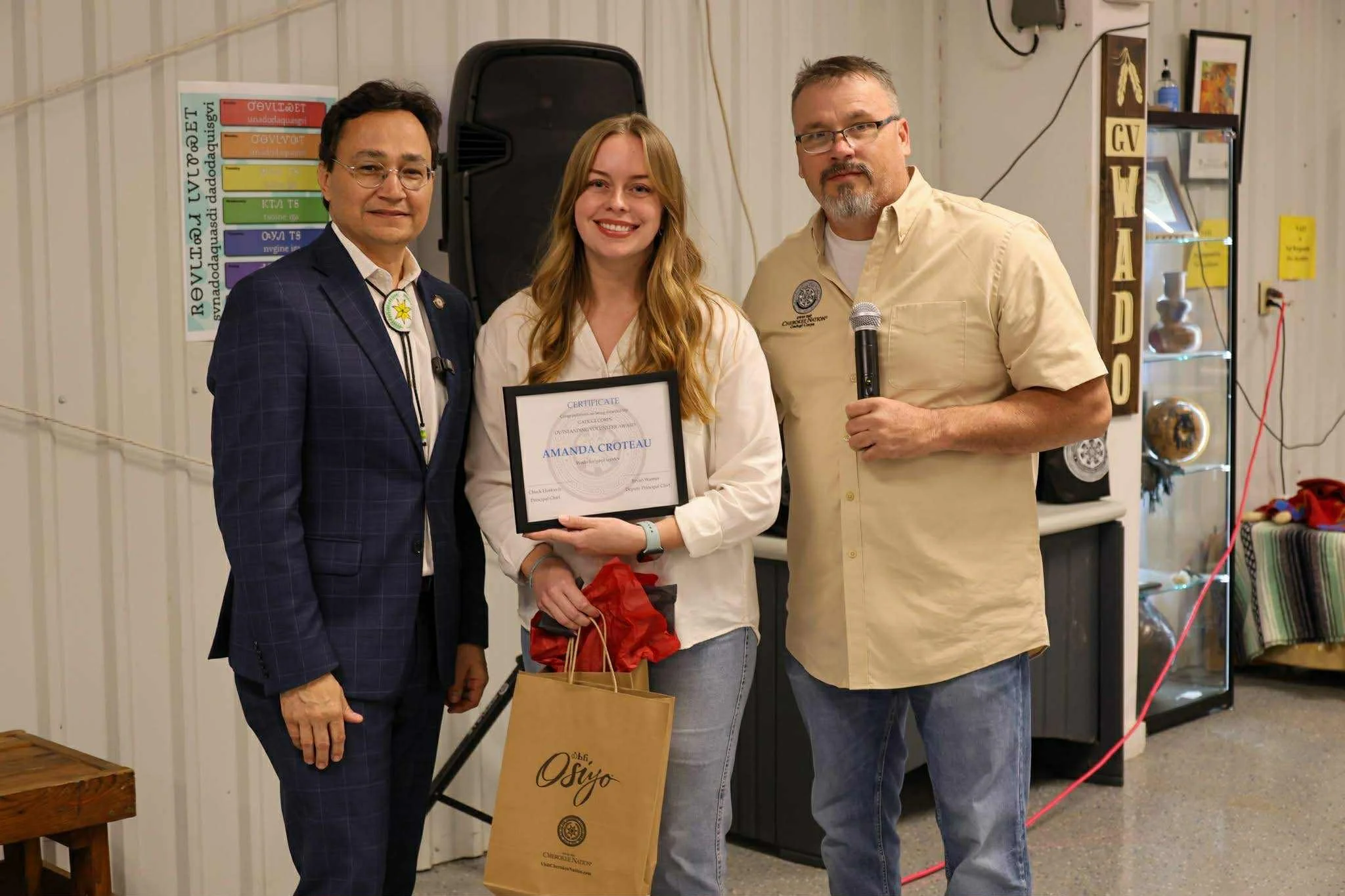 Pictured here: Amanda receiving Outstanding Volunteer award from Principal Chief Chuck Hoskin Jr and Gadugi Corps Director Shawn Crittenden at our April 27 Annual Event in Fairfield