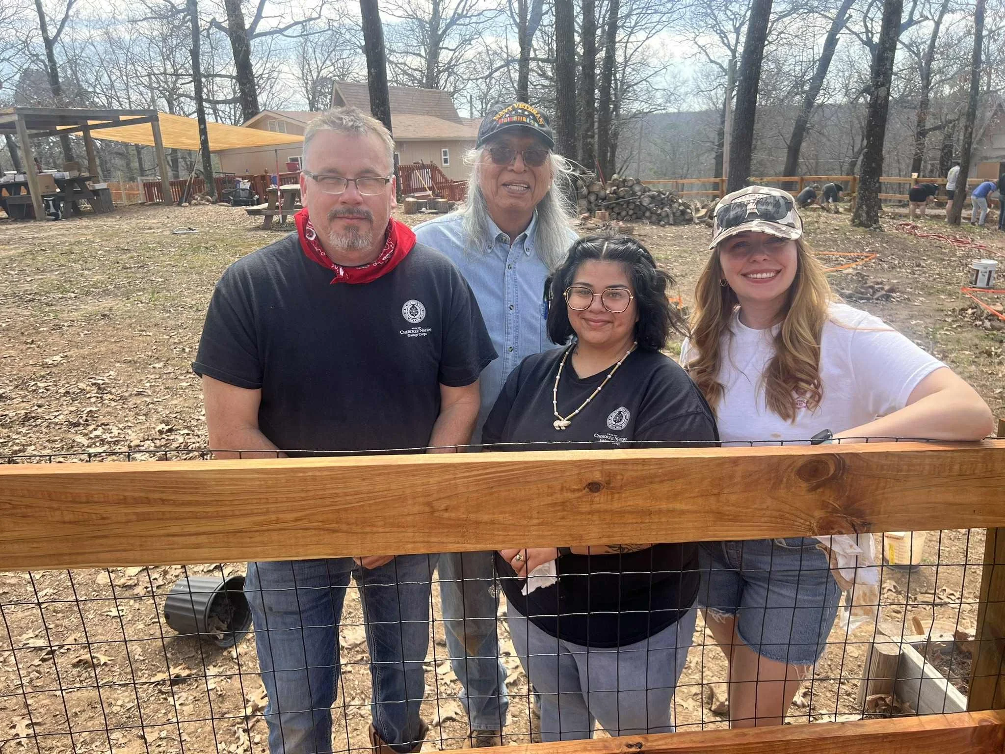 Pictured here: Amanda, Charlie Soap, and Gadugi Corps members staining fences for a children’s Cherokee language school
